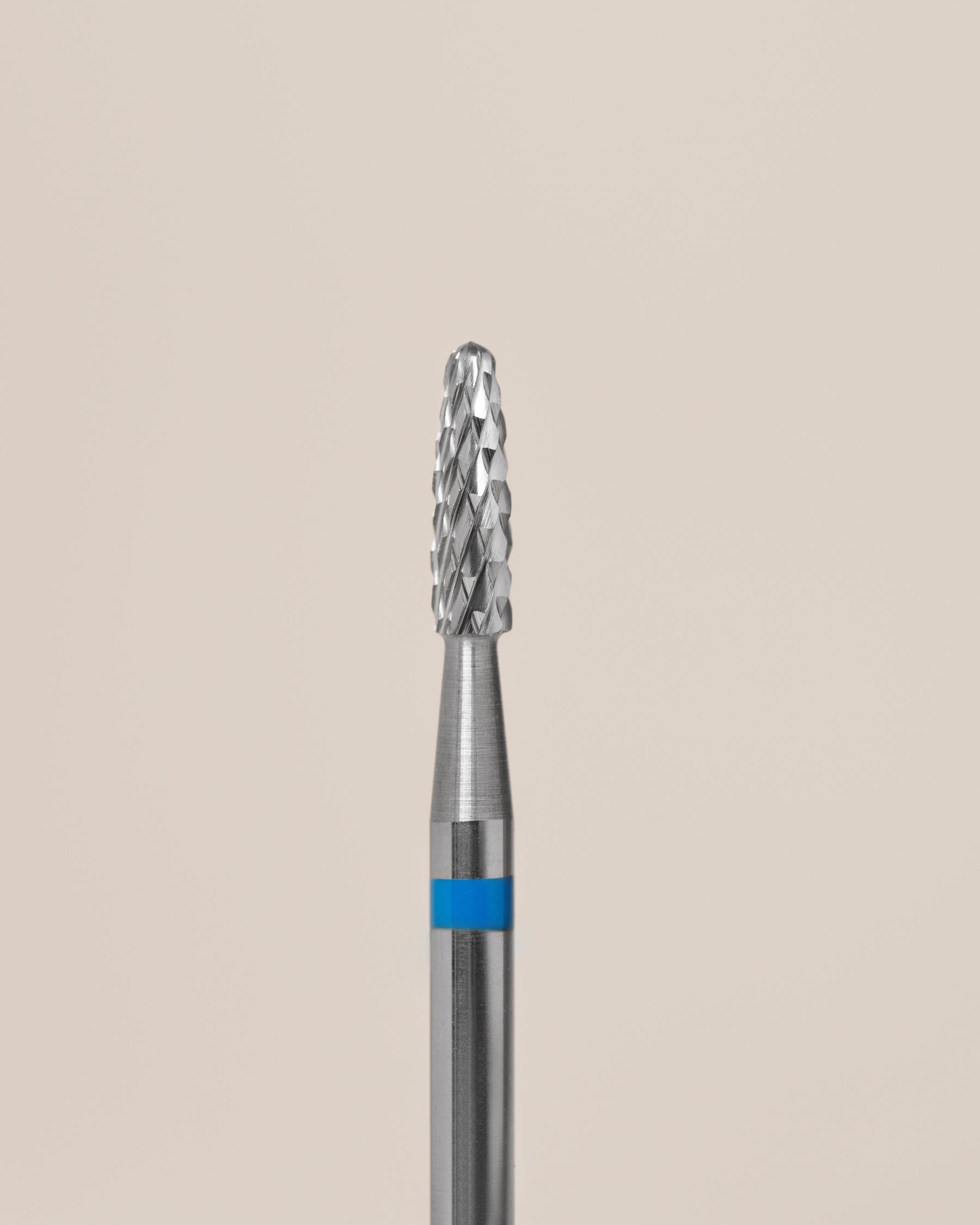 Capăt de freză profesional din carbură de tungsten, cu formă conică și granulație medie (bandă albastră), ideal pentru îndepărtarea materialului de pe unghii fără a deteriora suprafața naturală.